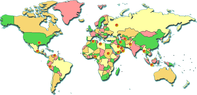 下图为中国石油集团全球勘探队和办事处分布图,其中闪动的圆点是以有勘探队的国家,静止的圆点是只有办事处但没有勘探队的国家。当鼠标上移致闪动的圆点时,能看到该地区的地名和相应的勘探队,点击相应的勘探队能弹出小窗口,观看其详细信息。