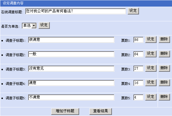 增加新的调查题目。 设定每各调查问题的属性,包括: 是否自填答案、是否需要多行填写、此问题是否允许。 用户多选、查看调查结果时是否需要汇总、用户在填写调查表时是否必答。 可设置调查表的表头、及背景颜色等信息。 可以查询、统计调查结果,可以删除废弃的调查表,节省可用的空间。
